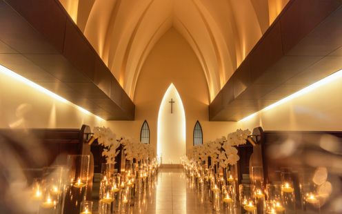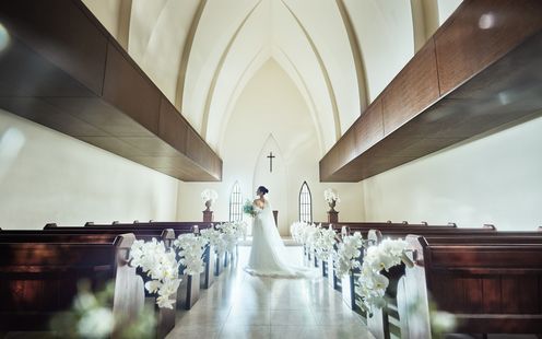 扉を開いた瞬間、凛とした空気が流れ、天井高13m、長さ9mの大理石のバージンロードが厳かな雰囲気を漂わせている独立型教会。サンタキアラでの挙式は、結婚式の1ヶ月前に専属牧師先生とカウンセリングを行い、当日を迎えるのでふたりらしいオリジナルセレモニーが叶うと評判!また、牧師先生からふたりに贈られる特別なコインを添えて完成する結婚証明書も人気。挙式後は青空のもとでフラワーシャワーやバルーンリリースなど多彩なアフターセレモニーをお愉しみいただけます。