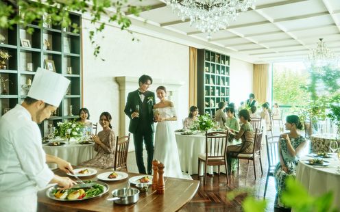 上品でありながらどこか懐かしい料理で、ゲストへ最幸のおもてなしを。フレンチ3ツ星店で修行シェフ×グルメガイド1ツ星の割烹料理長が手掛ける和フレンチは、幅広い年代の方に親しまれる味付けになっております。新郎新婦の出身地や思い出の素材を使った、ふたりだけのオリジナルメニューの相談や、世界に1つだけのオリジナルウエディングケーキをお創りしますので気軽にご相談ください。