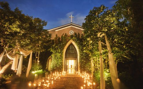 扉を開いた瞬間、凛とした空気が流れ、天井高13m、長さ9mの大理石のバージンロードが厳かな雰囲気を漂わせている独立型教会。サンタキアラでの挙式は、結婚式の1ヶ月前に専属牧師先生とカウンセリングを行い、当日を迎えるのでふたりらしいオリジナルセレモニーが叶うと評判!また、牧師先生からふたりに贈られる特別なコインを添えて完成する結婚証明書も人気。挙式後は青空のもとでフラワーシャワーやバルーンリリースなど多彩なアフターセレモニーをお愉しみいただけます。