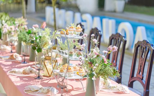 貸切空間だから叶う自由さがリラックスできる一日のポイント。ゲストとおふたりだけのパーティは、ガーデンでの乾杯を合図にバンド演奏がはじまります。華やかに飾られた空間で、シャンパンの泡のように眩しい笑顔がはじける光景はまるで映画のワンシーンのようです。ケーキカットやデザートビュッフェはもちろん、ランタンや花火など昼と夜で異なるパーティ演出を多彩にご用意しておりますので、ご相談ください。
