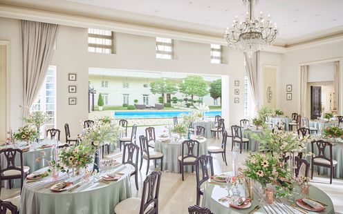 全館を一組で貸切って利用できる「アクアガーデン迎賓館 沼津」。全面の窓を開け放ってプライベートガーデンも一体となった貸切空間をゲストと存分に満喫してください。ゲストの一人ひとりとたくさん話して写真も撮りたいし、家族にはちゃんと感謝を伝える時間が欲しい、そんな願いを叶えられるようたっぷり時間がございます。