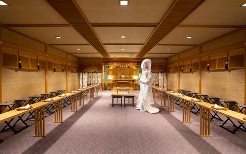 一歩足を踏み入れると檜が香る、自然と背筋を伸ばしたくなる凛とした佇まいの本格神殿。「縁結びの神」として有名な出雲大社の祭祀をまつる神殿で神前式が叶います。雅楽の調べが響きわたる中、三三九度をはじめとした古式ゆかしい日本の伝統的な儀式が行われます。