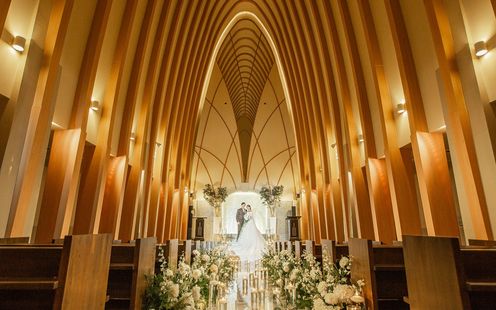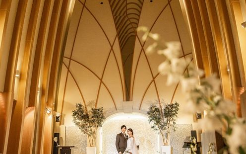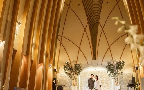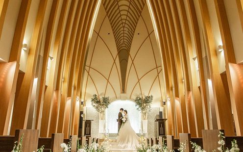 木の温もりに包まれたアーチ状の天井&シアター形式の配席が生み出す感動挙式