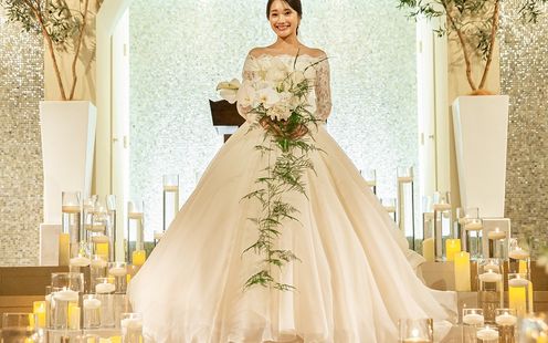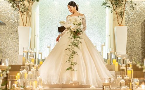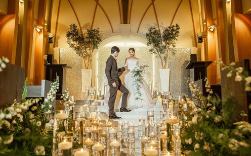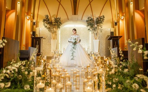 チャペルに入るとまず目に入るのは、木の温もりを感じる美しいアーチ状の天井。このアルコ(アーチ)は、式場の名前の由来にもなったアルコラッジョのチャペルを象徴するもの。高さ15mものリブ(アーチ)ボールトの梁が繰り返し使われ、シンプルなデザインながらも力強さを感じさせるデザインです。そんな迫力ある空間の中央には、約15mの白いバージンロード。祭壇へと向かう花嫁姿をより美しく引き立てます。またチャペル内の床は緩やかな坂で、後ろに座ったゲストからも新郎新婦のお顔が見やすいシアター形式になっています。まるで劇場にいるかのような造りが、挙式の感動を高めてくれます。