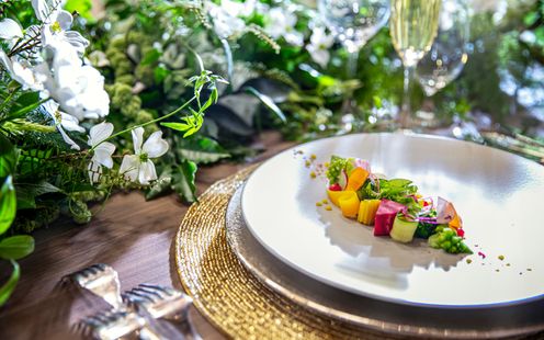 アルコラッジョでは素材の産地や大きさ・品種など細かい部分まで吟味し、全食材をシェフ自らが仕入れます。食材を選ぶ基準は「高い=よいもの」だけではありません。産地や製法による質の違いを見極め、新鮮なものだけにこだわります。また特別な1日を彩るお料理は、ただ美味しいだけでは不十分だと考えます。お客様に本当の美味しさを届けるために、徹底した温度管理のもと熱々のうちにゲストの皆さまに提供します。1つのテーブルを充分な人数で、サービスの充実にも力を入れています。