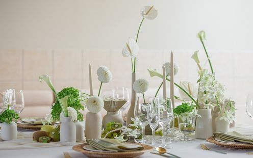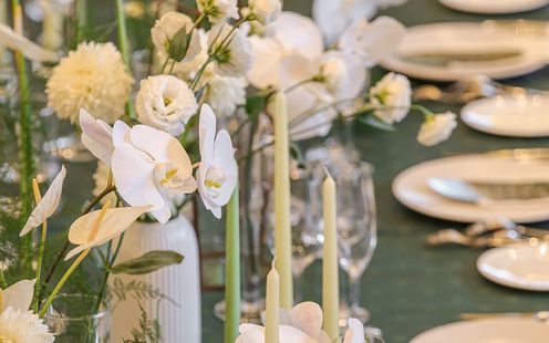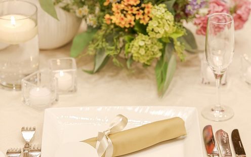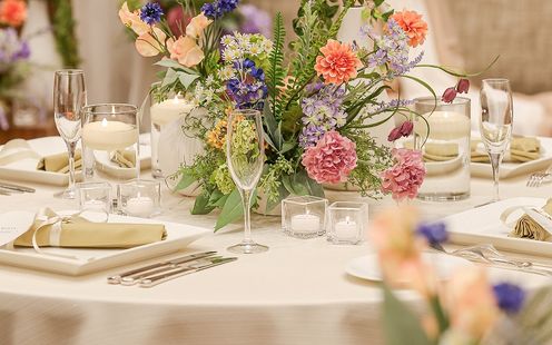アルコラッジョでは、専属のフラワーコーディネーターがおふたりにピッタリのコーディネートをご提案します。テーブルクロスの色や好きなお花で、会場をおふたりらしく彩りましょう。完成した会場コーディネートを実際に見るのも、当日までの楽しみの1つです。