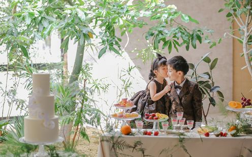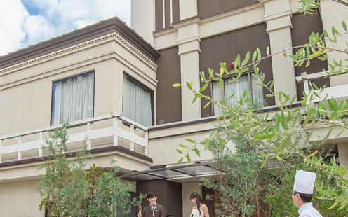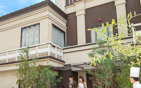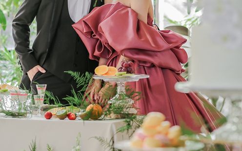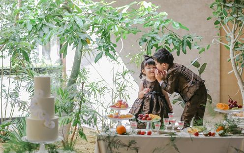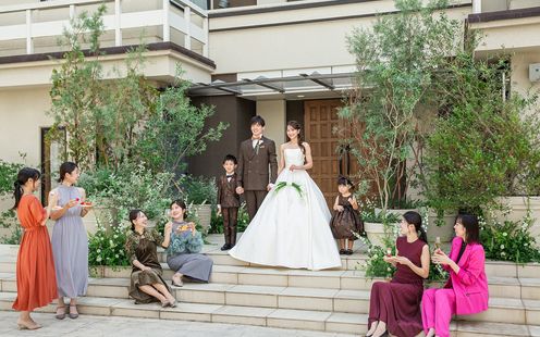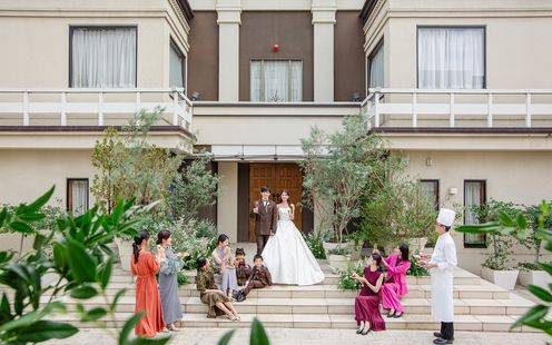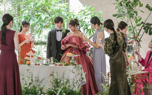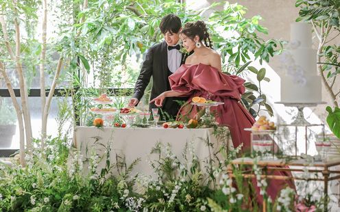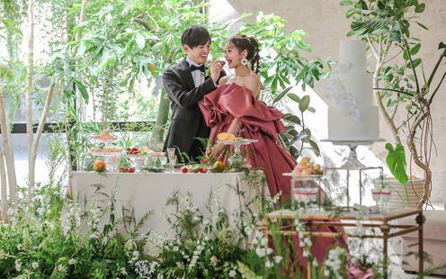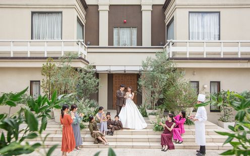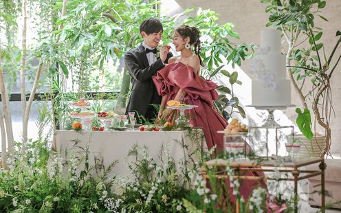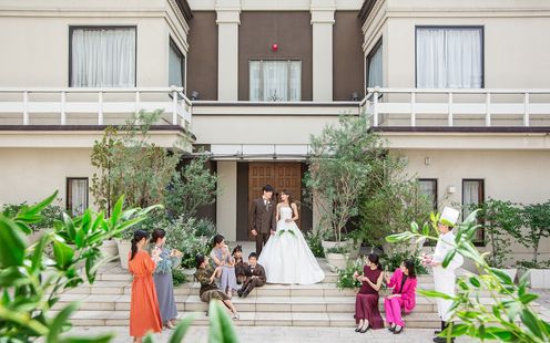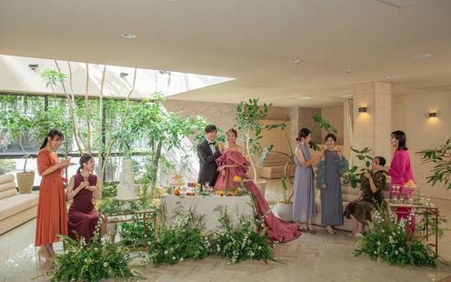 チャペルの大扉から一歩外に出ると、そこには都心とは思えないほどの緑豊かなガーデンスペースが広がります。ここではフラワーシャワーや写真タイムなどの演出を楽しんで。感動的な挙式の雰囲気とのギャップは、ゲストと距離がグッと縮まるきっかけに。夕暮れ時の、昼間と違ったロマンチックな雰囲気も魅力的です。