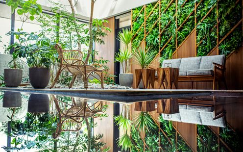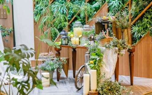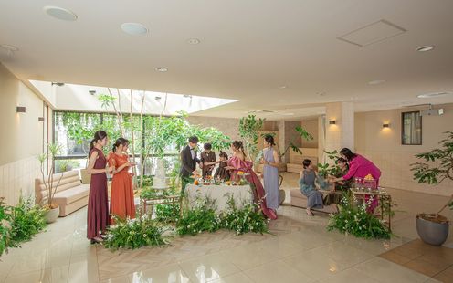 各会場には、室内ガーデンを併設。木や水など自然を感じる空間で窓からは自然光が入り、室内とは思えないほどの開放感が魅力です。それぞれプールやシンボルツリーなど会場のテイストに合わせたデザインに。空調も完備され、お天気や気温を気にすることなく、快適にガーデンタイムをお過ごしいただける点が好評です。