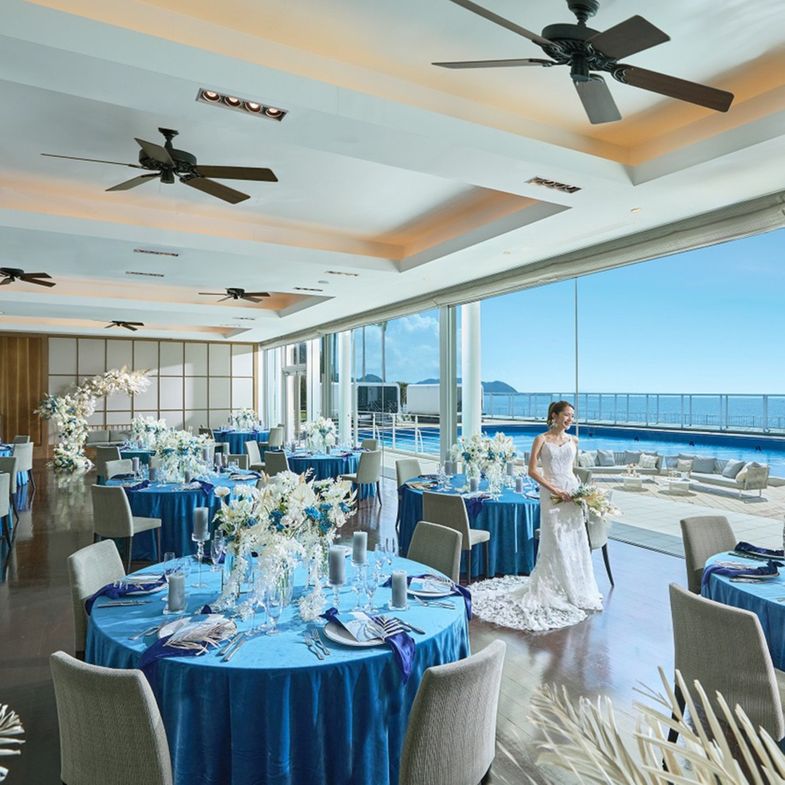 02.三方を海に囲まれたガラス張りの独立型チャペルでの挙式&パーティ空間もオーシャンビュー