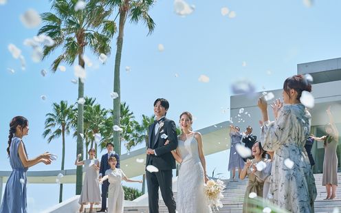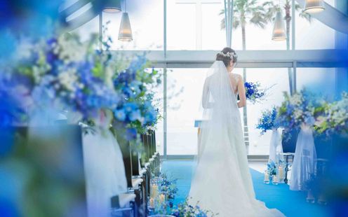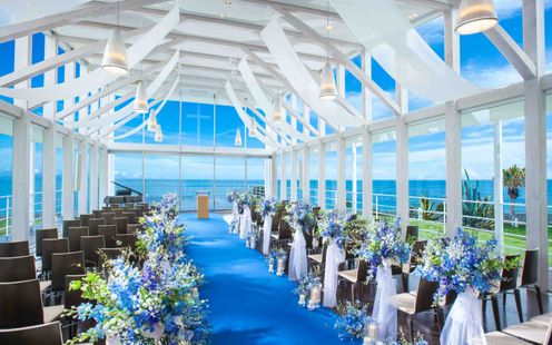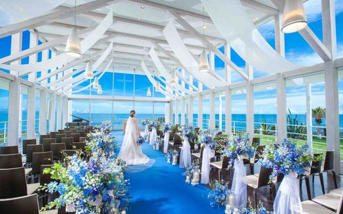 果てしなく広がる海&コバルトブルーのバージンロード、白い木のコントラストが印象的な独立型チャペル。ガラス張りの開放感あふれるチャペルでは、海外ウエディングのような挙式が叶う。どこまでも続く水平線に向かって歩むバージンロード入場。参列したゲストの心にも刻まれるアットホームな挙式が話題に。