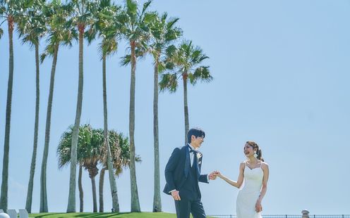 陽光に照らされてキラキラ輝く海と美しい景観がふたりの明るい未来を予感させてくれる。