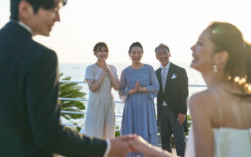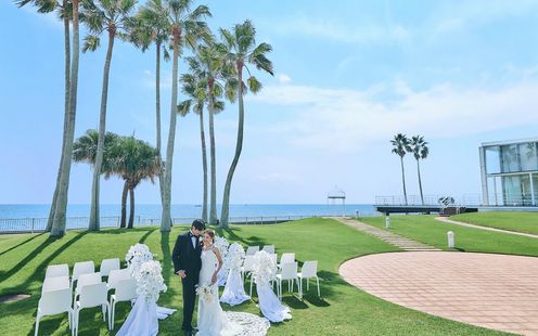【都心から電車で約60分、鎌倉から約10分】すべてのパーティ会場に開放的なガーデンやテラスを完備している開放感!広大なガーデンはセレモニーはもちろん、ゲストと笑顔あふれる演出や、フォトスポットとしても大人気!広大な海や空、ヤシの木をバックにオープンエアな空間でゲストと語り合うひとときを