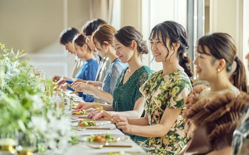 木漏れ日に抱かれた開放感抜群のパーティ会場は、ダークブラウンの差し色がアクセントとなり、大人の落ち着いた雰囲気を醸し出します。緑を望みながら、食事や会話を楽しむ和やかなパーティが繰り広げられます。また、パーティ会場に隣接したガーデンは、背の高い木々たちが都会の喧騒を遮り、ゆったりとした時が流れます。フィンガーフードやオリジナルドリンクを用意して、ゲストとのふれあいをお楽しみください。