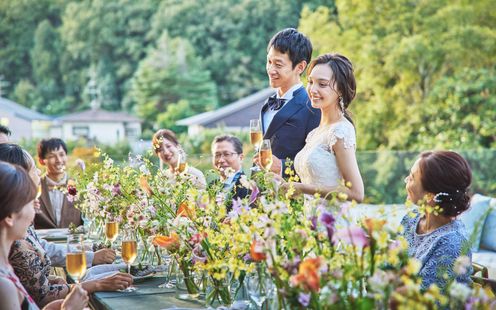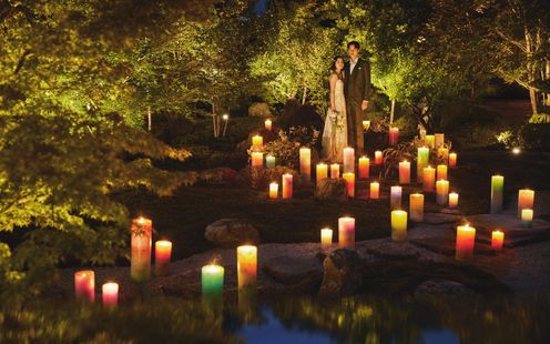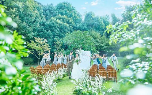 1700坪もの広大な敷地には、本物の大自然が広がり、ふたりの憧れの演出が自由度高く叶います。季節ごと様々な表情に変化し、春には桜、夏には新緑や竹林のまばゆい緑、秋には紅葉と和装・洋装もどちらも似合う雰囲気に彩られます。広大なガーデンの使い方はふたいの希望通りに。例えば、挙式後のフラワーシャワーやバブルシャワー、ブーケトスなどのアフターセレモニーをはじめ、パーティではグリル演出や寿司ビュッフェ、デザートビュッフェ、バンド演奏、花火演出までゲストとアットホームなひとときをお過ごしいただけます。なお、テントを常設しているのであいにくの雨でも安心!