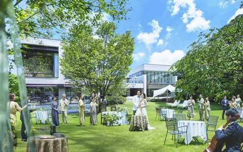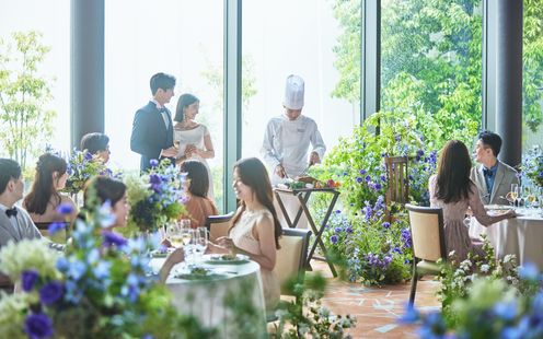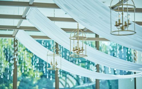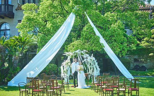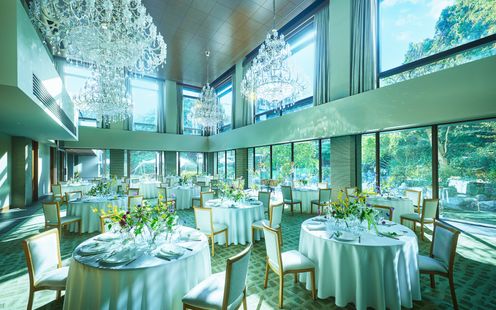 大きく広がる空と降り注ぐ太陽の光、心地よい風を感じながら開放的なガーデンウェディングはいかがでしょうか?ふたりの背景には滝が流れ、水の煌めきがドラマチックな瞬間を演出。 木々の間をそよ風が吹き抜ける音や小鳥のさえずりなど、自然の音もおふたりへ祝福を届けます。※着席110名まで