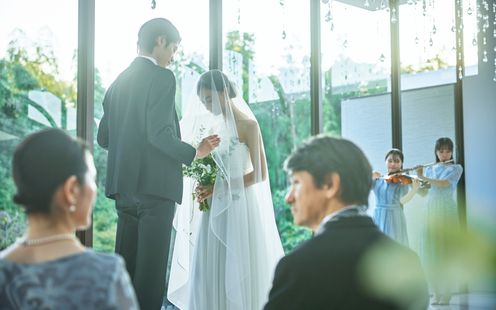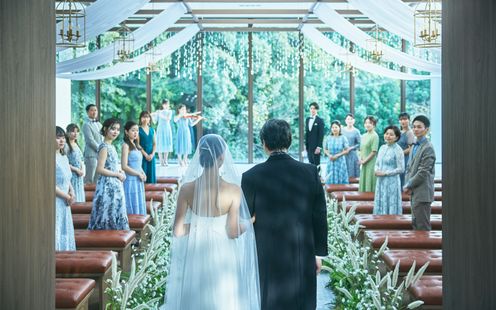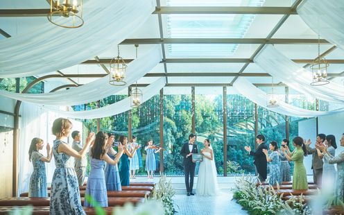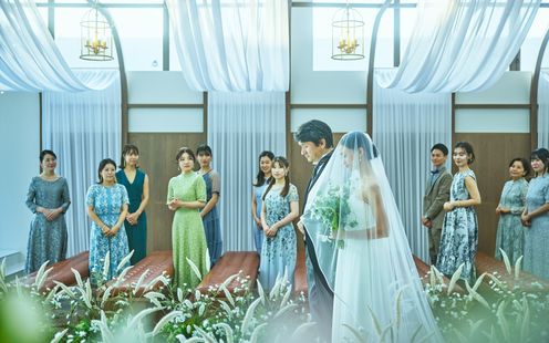 3面の窓やサンキャッチャーから差し込む自然光がチャペル内を照らし、まばゆい緑が美しい木の温もりあふれるチャペル。あいにくの雨でも明るい空間なので花嫁のウェディングドレス姿も美しい写真をたくさん残せます。キリスト教式のほか、和装人前式、神前式も叶います。また、挙式後はガーデンでフラワーシャワーやブーケトスなどのアフターセレモニーをはじめ、ゲスト全員との集合写真も撮影可能です。光と緑に包まれた憧れの場所で感動セレモニーを叶えて。また、挙式でリングドッグや、近郊の神社で行う本格神前式もサポートいたしますので気軽に相談を。※着席96名まで