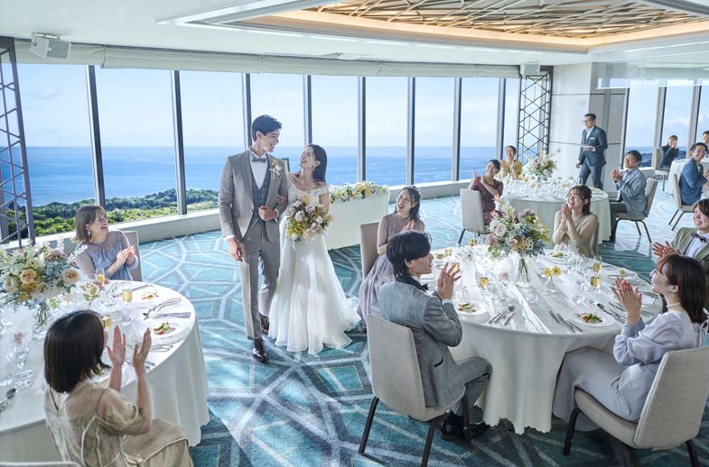 ホテル最上階にあり一面ガラス張りになっていて海を見渡すことができます。展望台から景色を見ているような感覚です。乾杯まではカーテンが閉まっていますが乾杯と同時にカーテンが開き、ゲストと新郎新婦が同時に感動を味わうことができます。