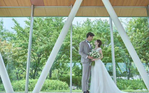 雄大な相模湾をみわたす緑豊かな高台に佇む独立型の「クリスタル グレイス チャペル」。真っ白なベンチシートとマリンブルーの長さ13mにおよぶバージンロードのコントラストも印象的。アフターセレモニーは四季の彩りを感じるガーデンへ繰り出してフラワーシャワーやバルーンリリース、記念撮影をお楽しみいただけます。