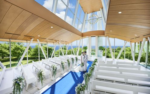 全面の窓から降り注ぐ陽光に満たされる絶景のチャペル