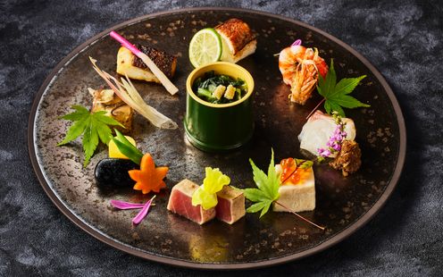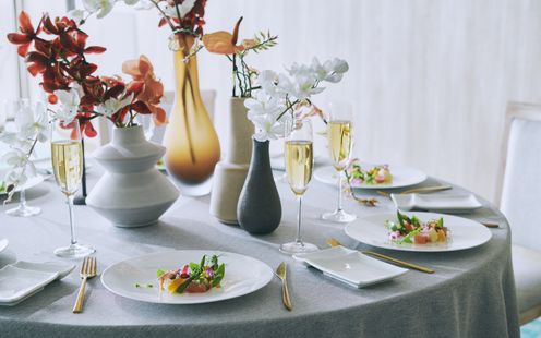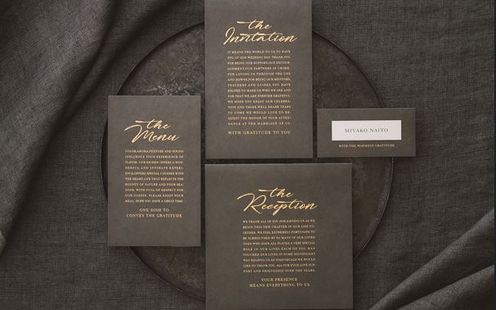 かけがえのない家族、友人、大切なゲストへの感謝の気持ちを込めてもてなすにふさわしい料理。それは、『洗練された美しい視覚と、明快な味覚』であると考えました。洗練された美しい視覚は、デザイナーとコラボすることで、見るものを感動させるほどの美しさに、明快な味覚は、その日の気温や天気に合わせ、1秒、1℃、1gと調理へのこだわりで表現しております。おふたりとゲストに『美しくおいしい記憶』として深く刻まれることを願っております。