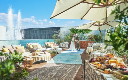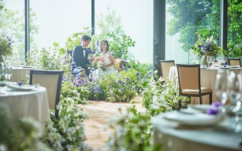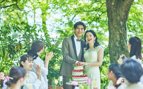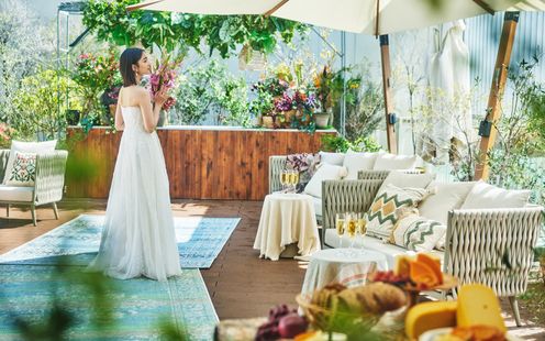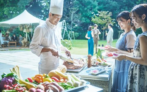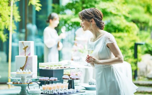 噴水や滝の音に癒されるデッキテラスでは、デザートビュッフェやゲストとの記念撮影などおふたりの希望で自由に利用できるのが魅力です。青い空と優しい光、緑に彩られた空間でのひとときをお楽しみください。