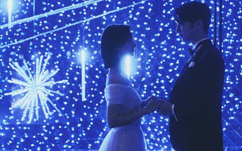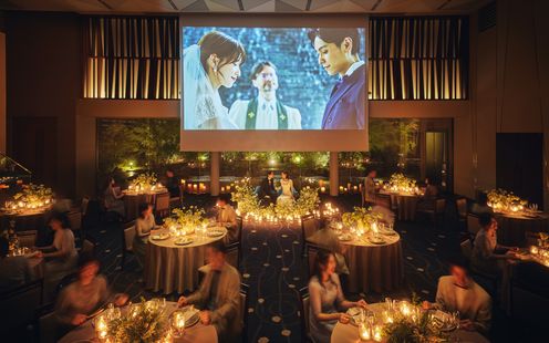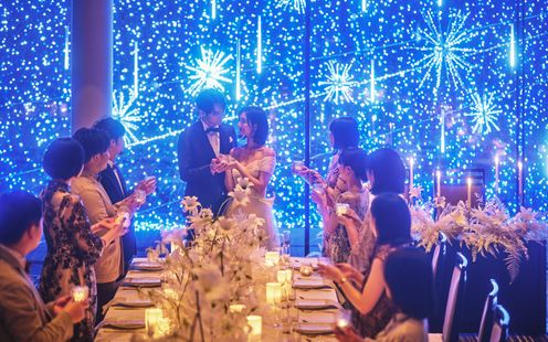 煌めくイルミネーションが美しい「紡(つむぎ)」。300インチの大画面映像演出やオープンキッチンからの料理演出、階段入場など多彩な演出が叶う空間です。この会場も日程により5名より利用が可能ですのでお問合せください。
