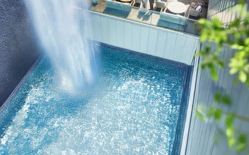 12mもの噴水が吹き上がる青空が開放的なデッキテラス