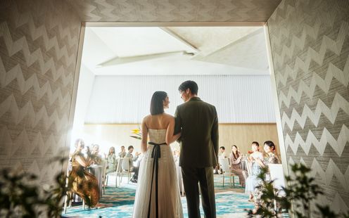 水面に浮かぶ純白のチャペルはふたりを包み込むような繭型の空間。ぬくもりを感じるドーム型の室内にオルガンや賛美歌が美しく響き渡り幻想的なセレモニーを演出します。純白の美空間では和装も映え、凛とした神前式も叶います。また、近隣神社でのセレモニー後の披露宴も受け付けております。※着席110名まで