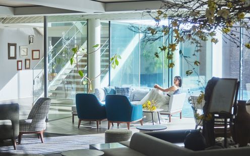 ゲスト同士の会話も自然と弾む、壁一面の窓から差し込む陽光が明るく開放的なラウンジ