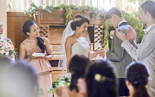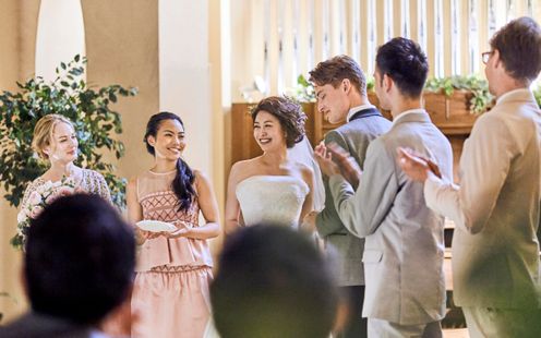 アーチ型の天井に響き渡るパイプオルガンの音色と聖歌隊の歌声や、無数の星が降りそそぐ光の演出、祝福の羽根が舞い降りるフェザーシャワーなど、演出の数々でゲストの方々を魅了するロマンティックなセレモニーが叶います。