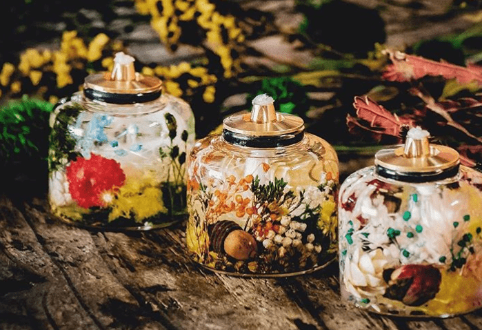 ハーバリウムアルコールランプは、「キャンプのある暮らし」をコンセプトにライフスタイルの発信空間やフードのコーディネート イベント企画などを行なっているクリエイターズユニットCAMMOC(キャンモック)のデザイナーmami(三沢真実)さん が作っている作品です*