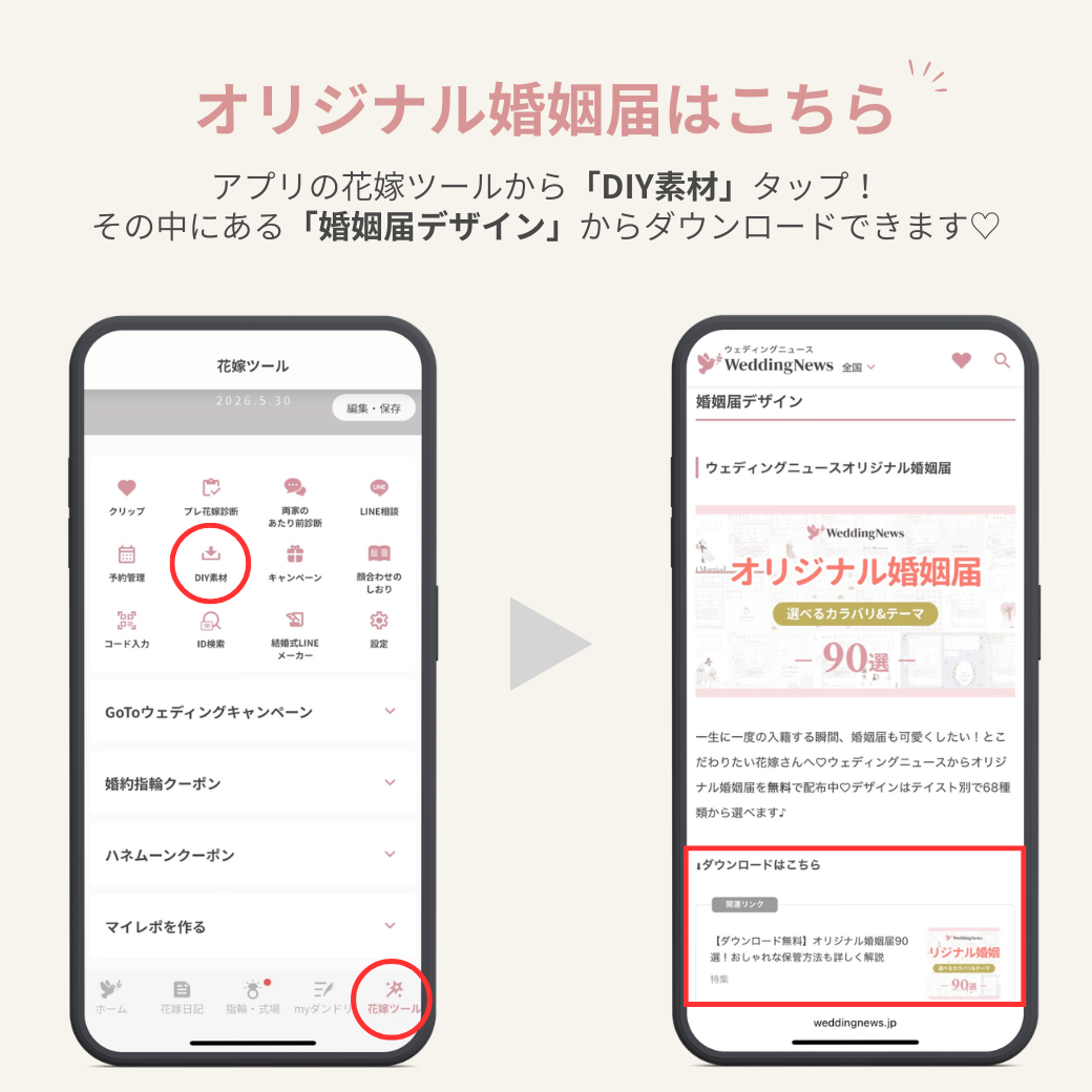 そんな特別な瞬間を可愛いアイテムで彩ってほしいという想いから、ウェディングニュースではおしゃれなオリジナル婚姻届を作りました♡