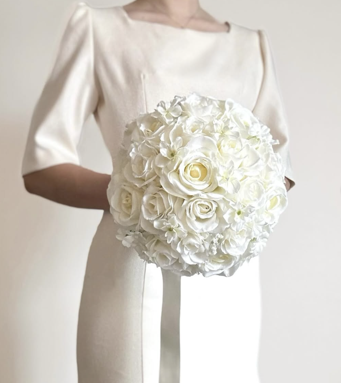 ブーケを決める時に重要なのが、ウェディングドレスを着て持ったときに全体のバランスがいいかどうか。