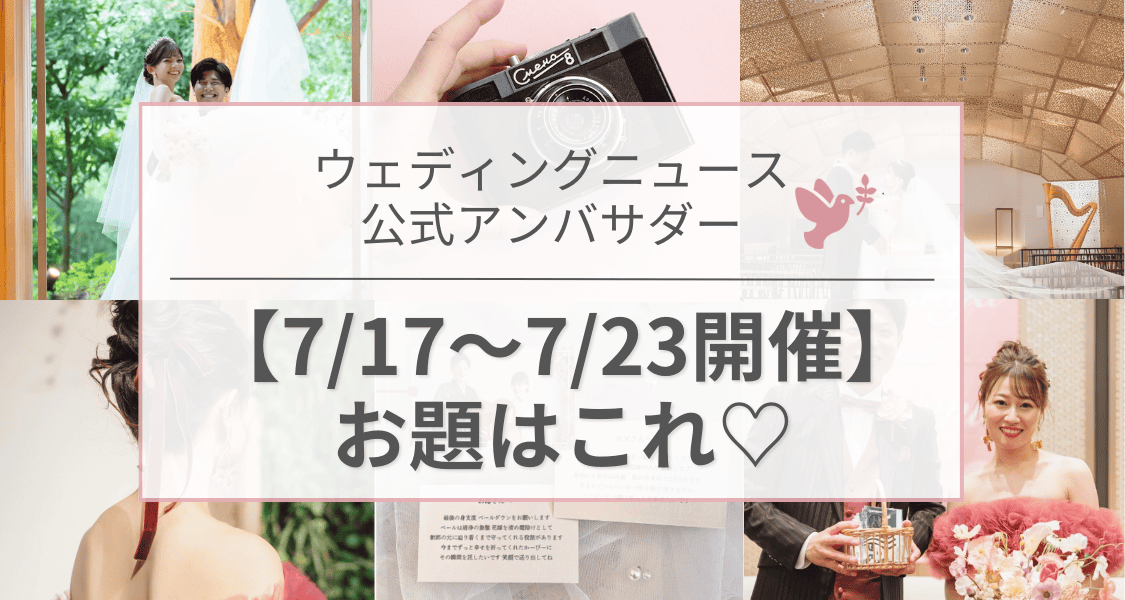 7/17(水)〜7/23(火)で開催する今回は、花嫁美容・花嫁DIY・新生活などを用意しました!好きなお題を選んでいただき、どのお題をいくつ投稿してもOKです*