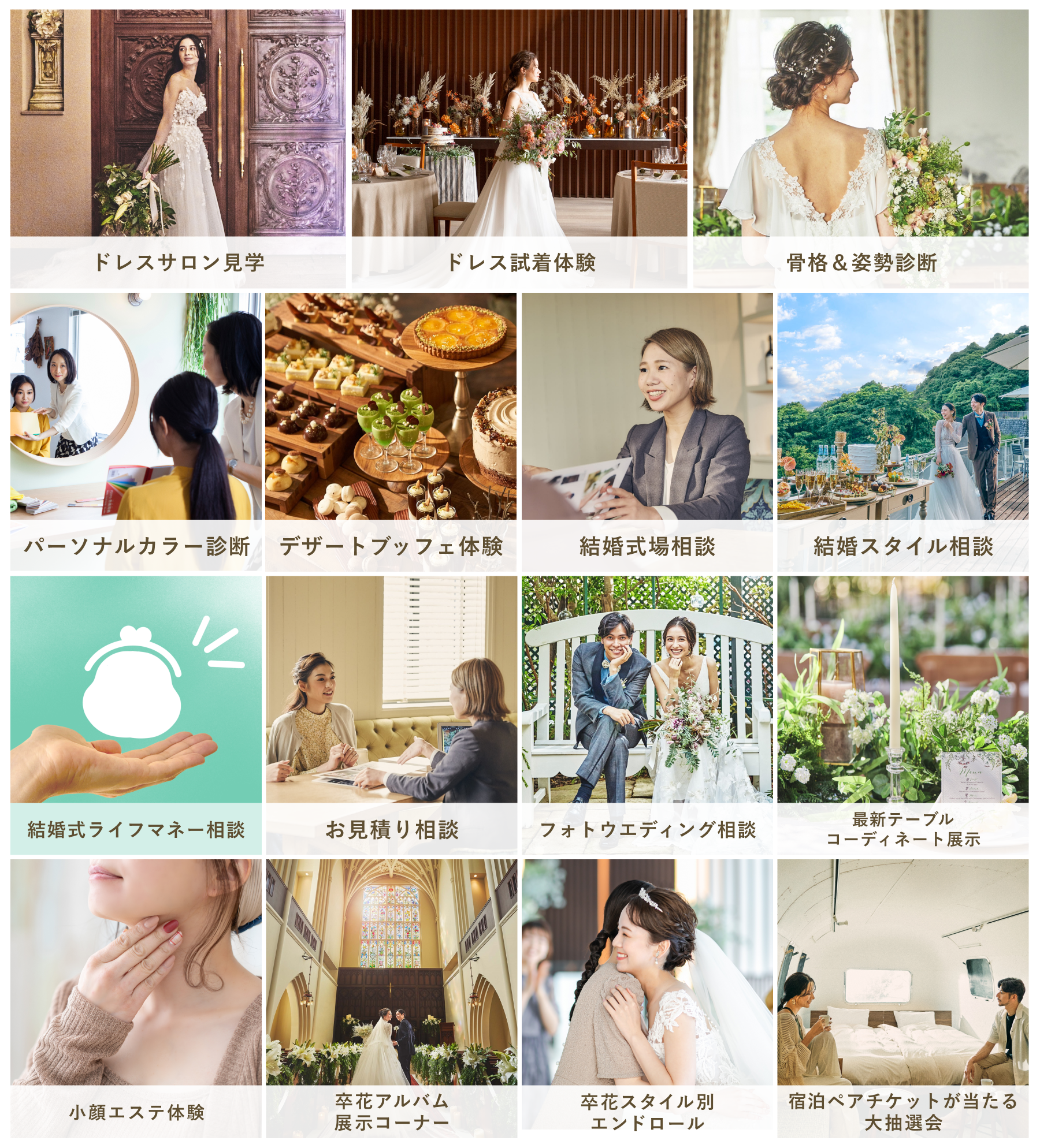 【コンテンツ一覧】ドレス試着や骨格診断、プロに式場相談できるブースも!