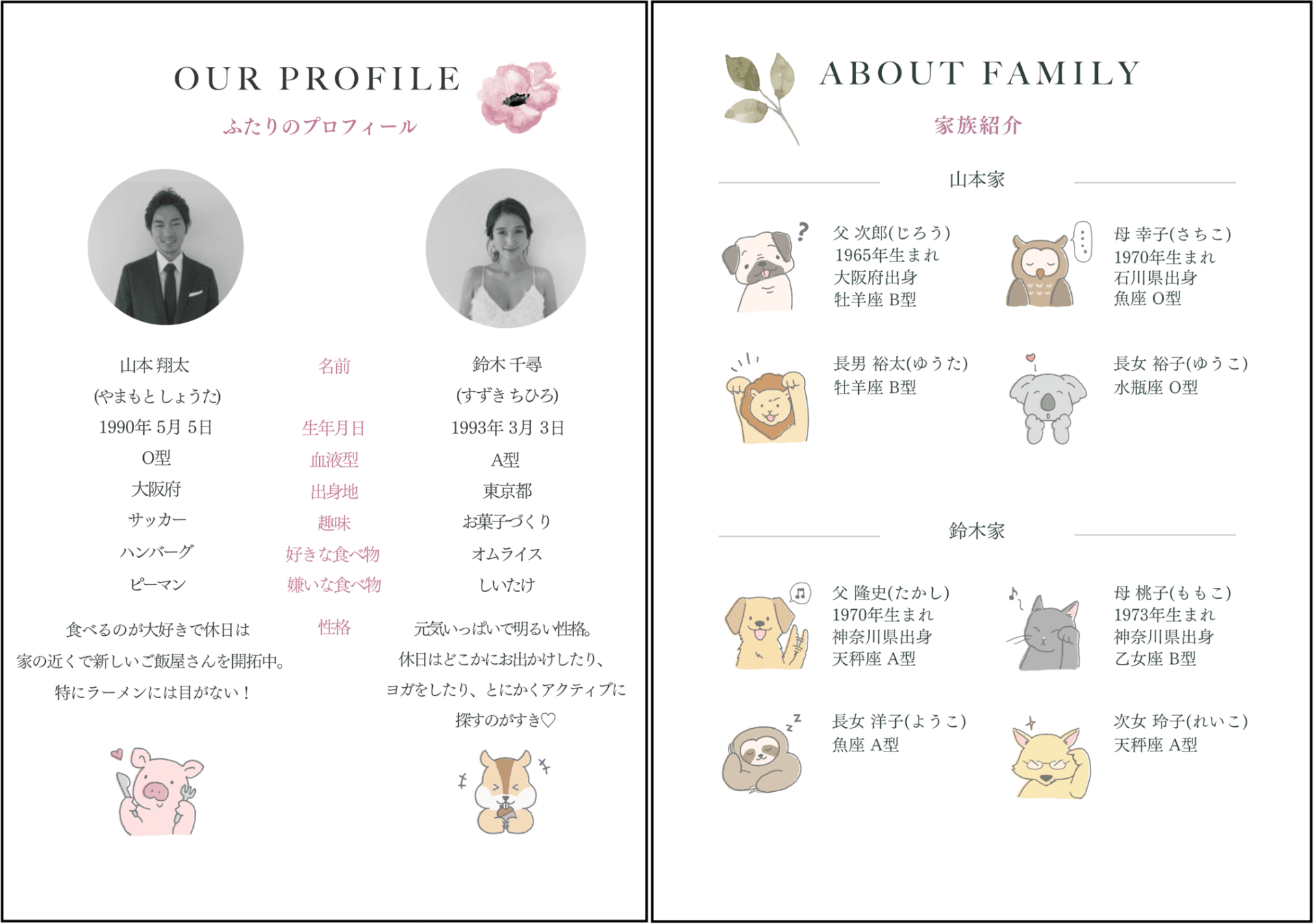 そこで、両家顔合わせしおりの「家族紹介」や「プロフィール」に使える「動物イラスト」が新登場!無料でダウンロードが可能です!