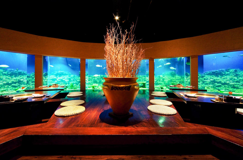 オリジナリティ溢れる7つのレストランとラウンジ・バーが特長のルネッサンスリゾート沖縄。大きな水槽があり、自由に魚が泳いでいます。