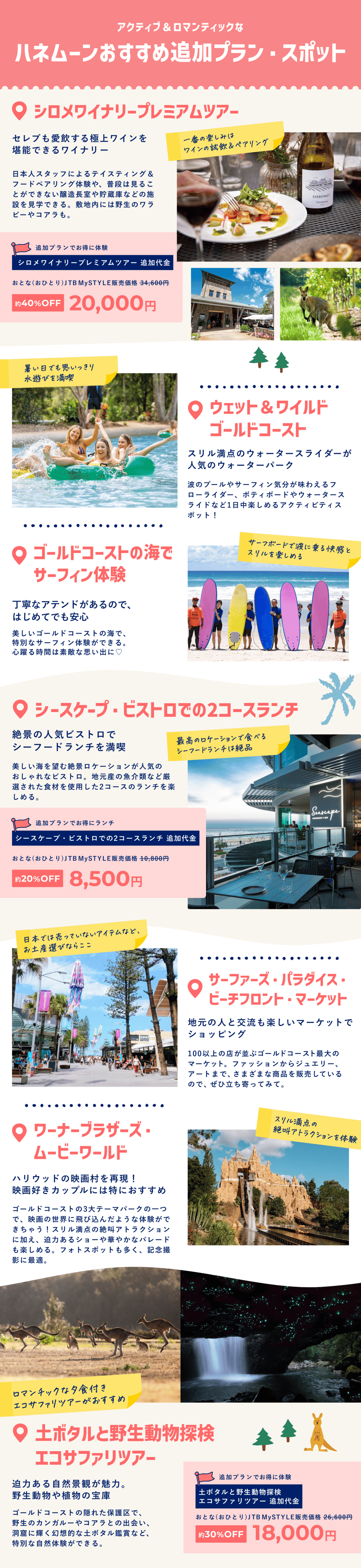 ここからは、ハネムーンと女子旅をとっておきな旅にしてくれる厳選追加プラン・スポット・ホテルをご紹介!
