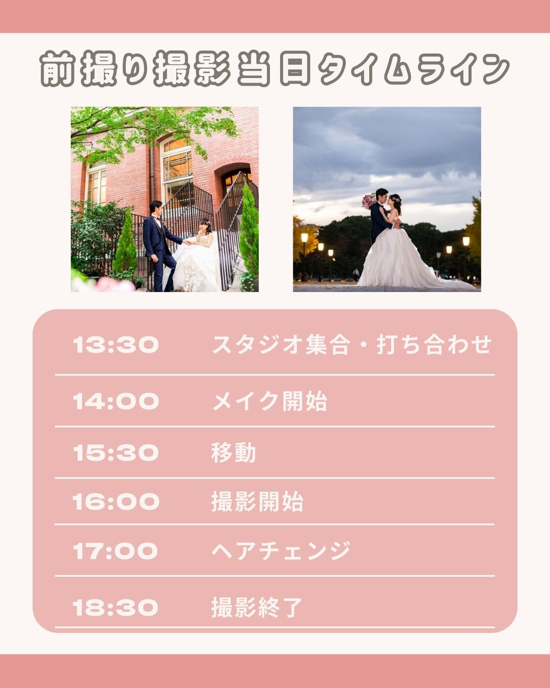 前撮り写真は結婚式当日に使用する方も多いですよね!後輩花嫁さんたちが前撮り撮影当日を準備万端で臨めるように、どんなスケジュールで過ごしたか教えてください^^
