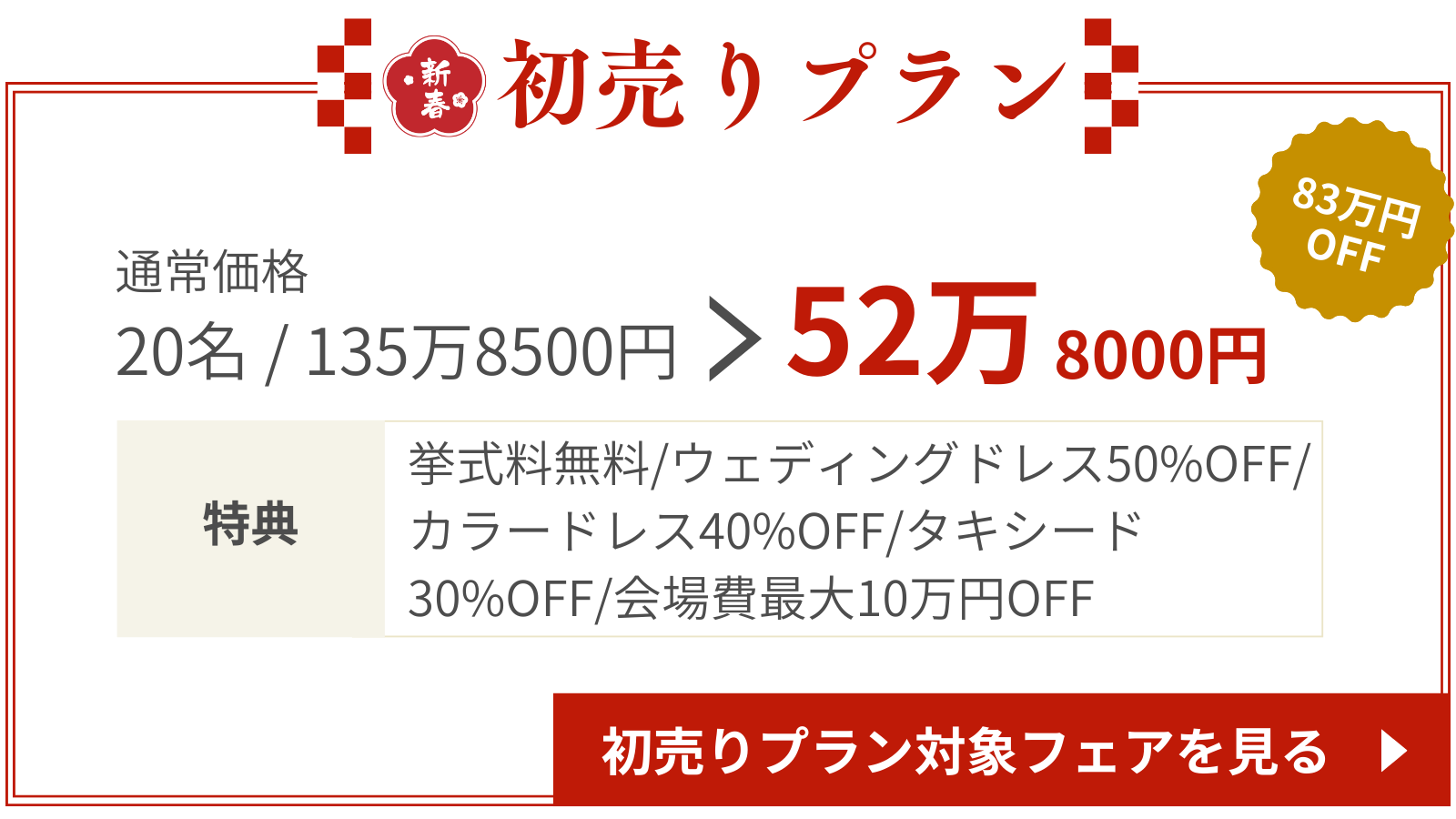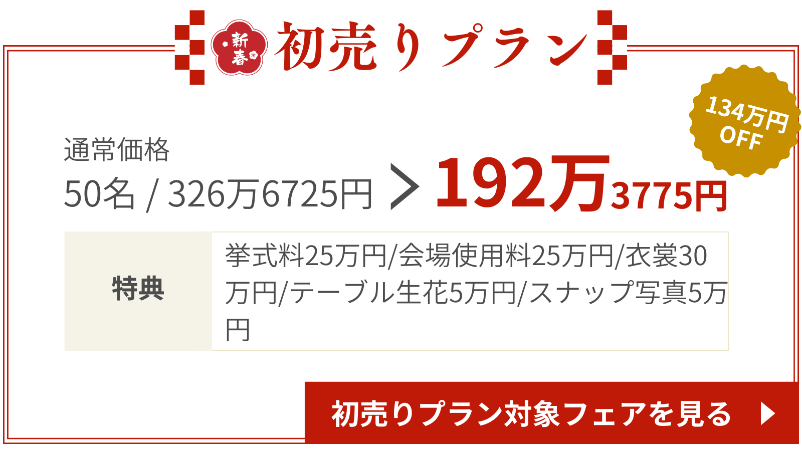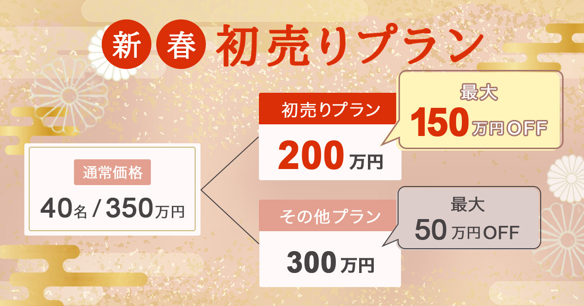 2026年新春初売りプラン!2026年6月末までの結婚式が超お得に!気候も良く、大人気の春の結婚式♡通常価格より大幅割引されたプランが登場。1月31日までに対象の結婚式場で契約した方限定のプランだからこの機会をお見逃しなく!