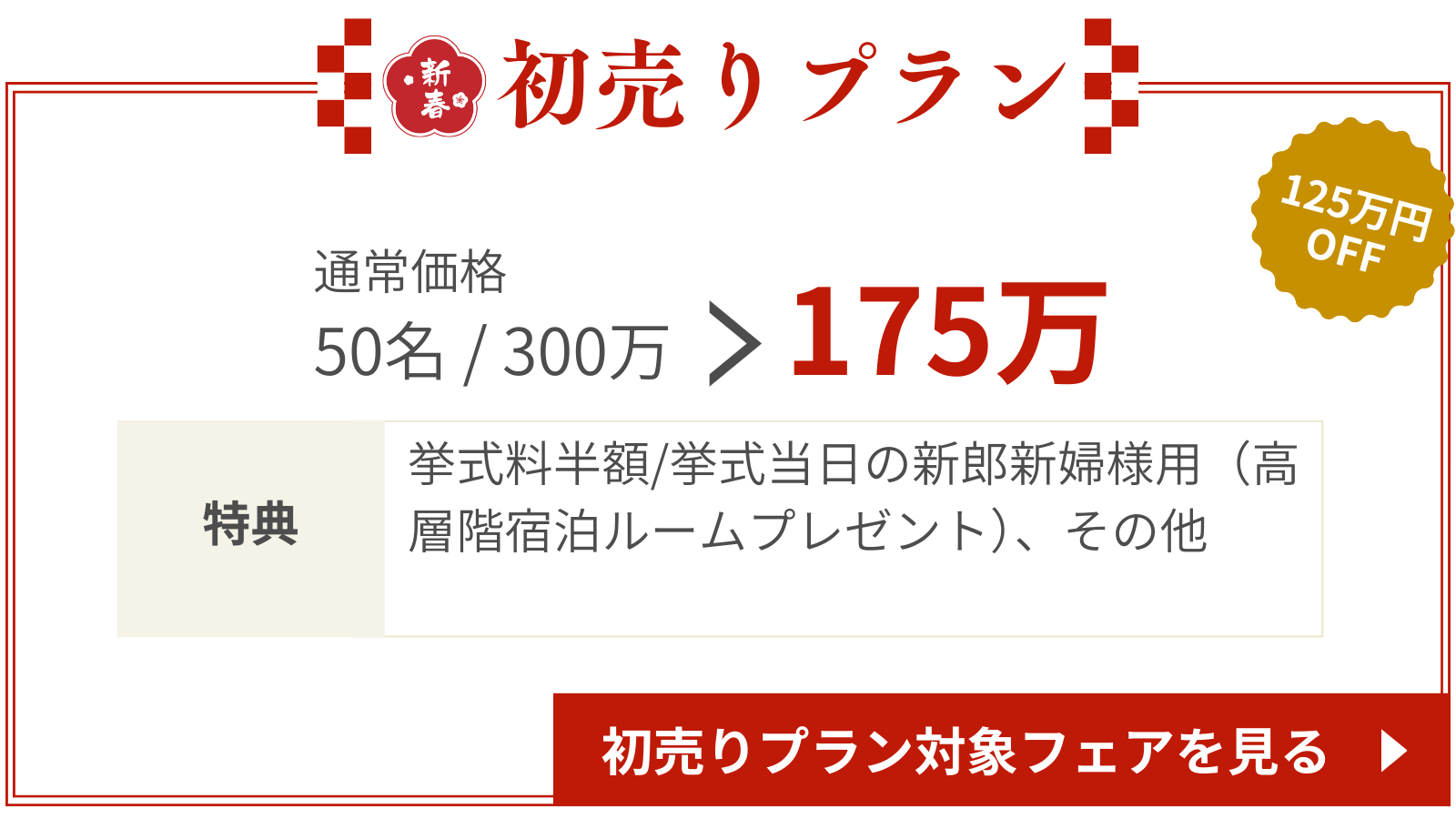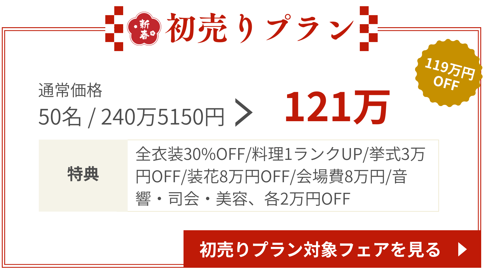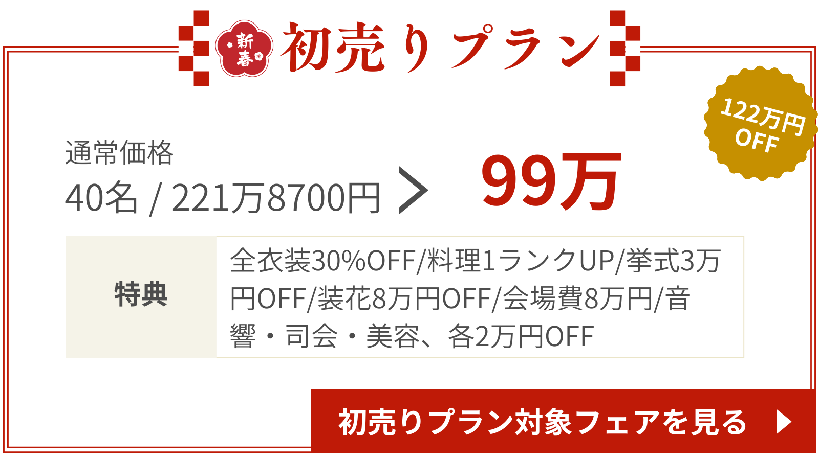 2026年新春初売りプラン!2026年6月末までの結婚式が超お得に!気候も良く、大人気の春の結婚式♡通常価格より大幅割引されたプランが登場。1月31日までに対象の結婚式場で契約した方限定のプランだからこの機会をお見逃しなく!