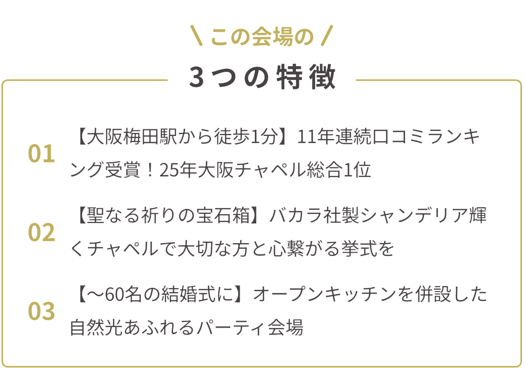 【大阪梅田駅から徒歩1分】11年連続口コミランキング受賞!25年大阪チャペル総合1位