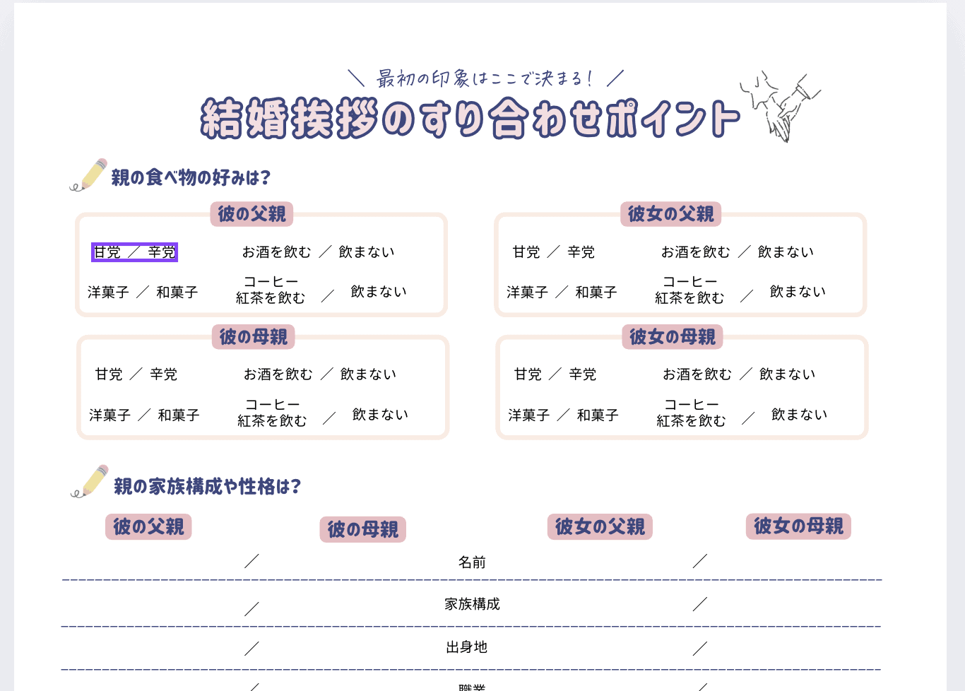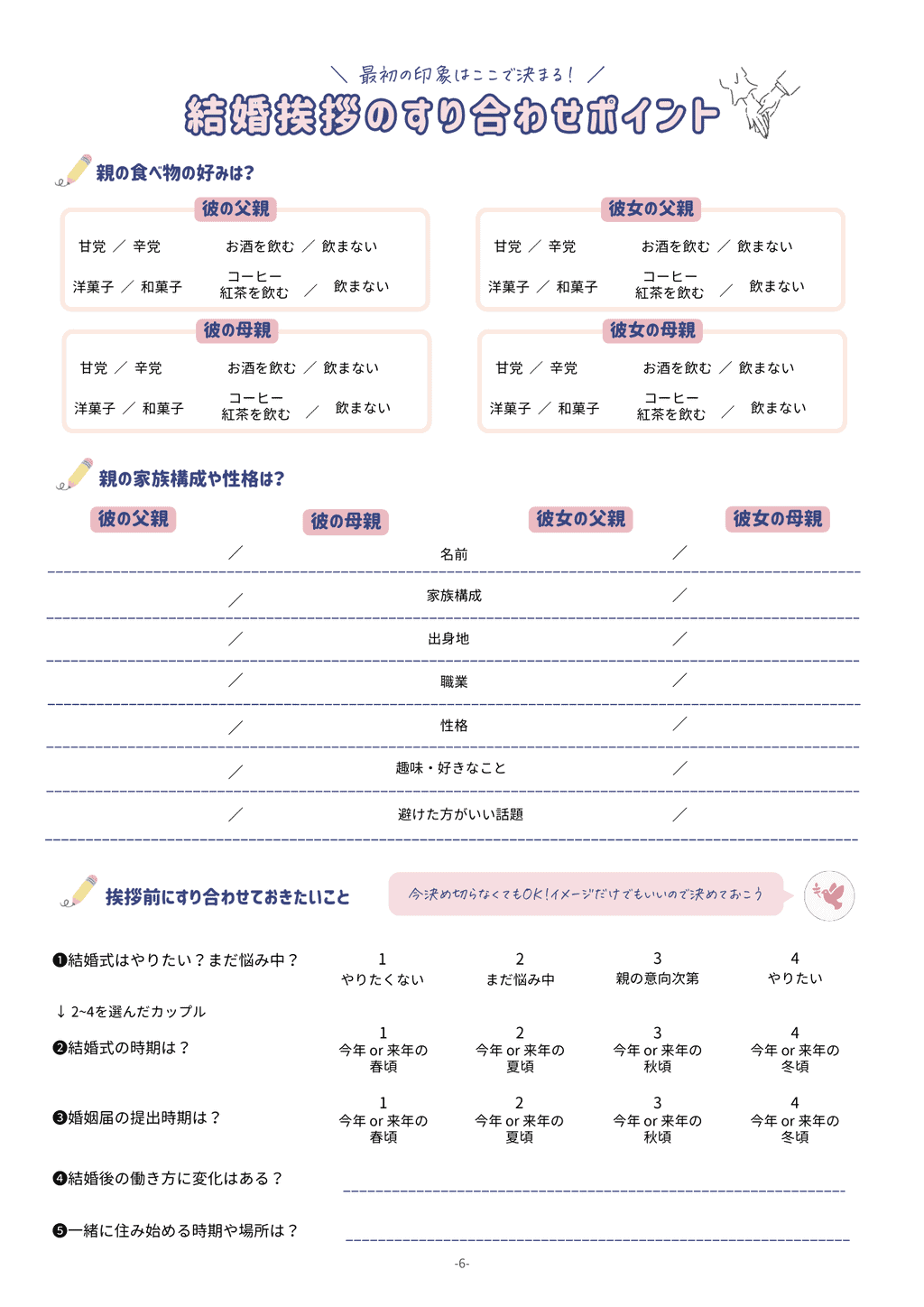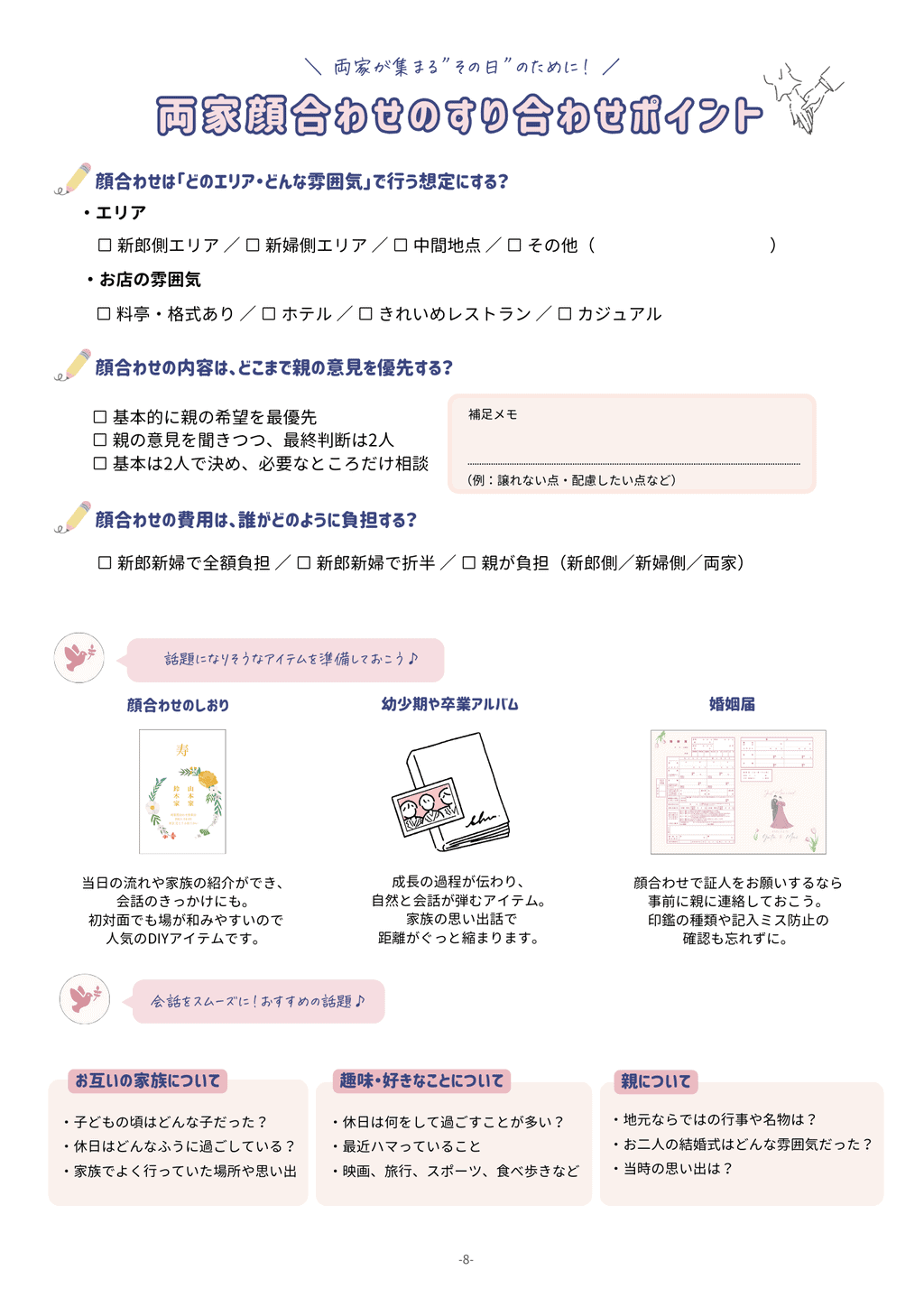 また、「すり合わせポイント」のページは、スムーズに準備が進むようにお互いの考え方や、親御さんの希望などをすり合わせて書き込めるようになっています♡