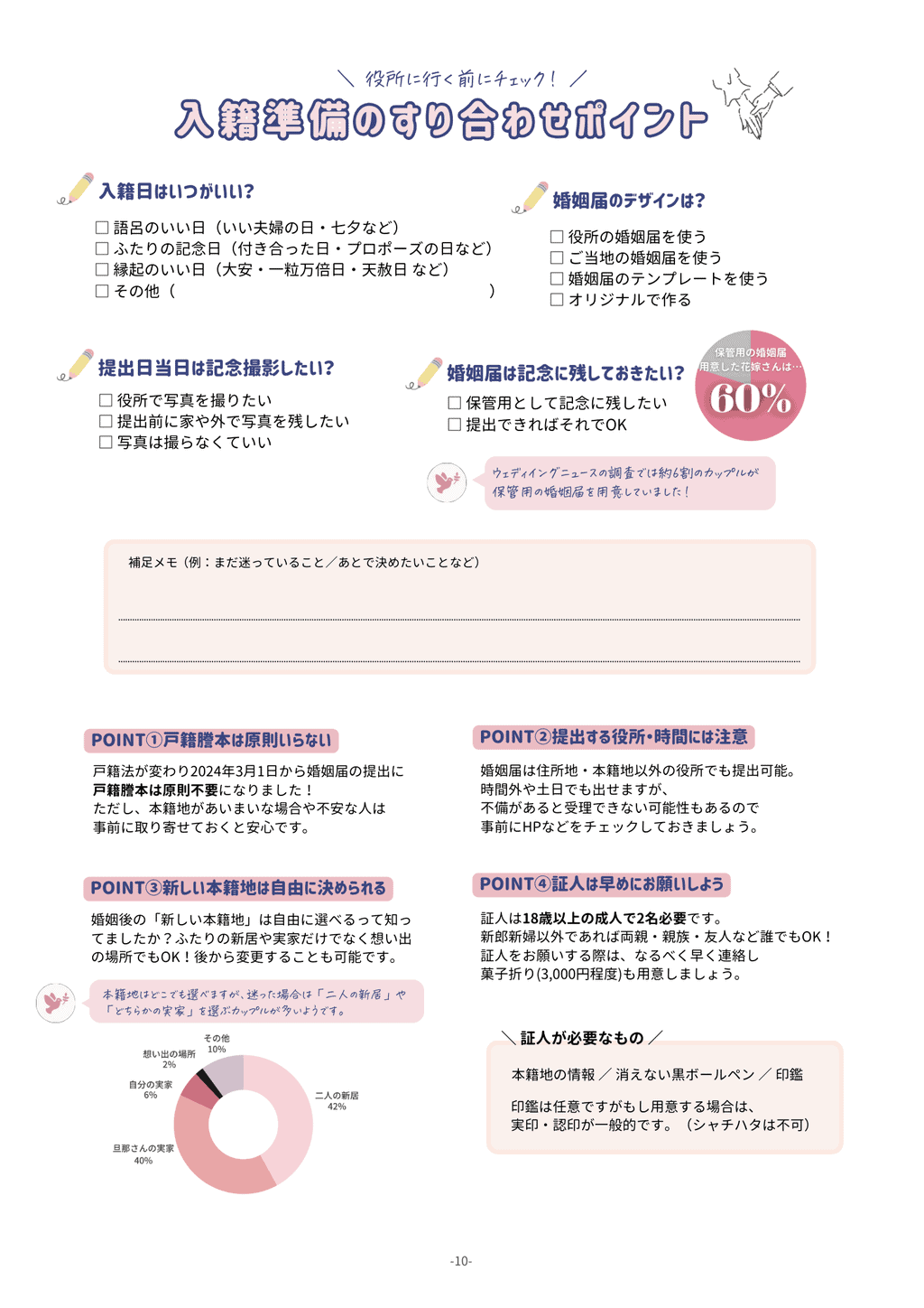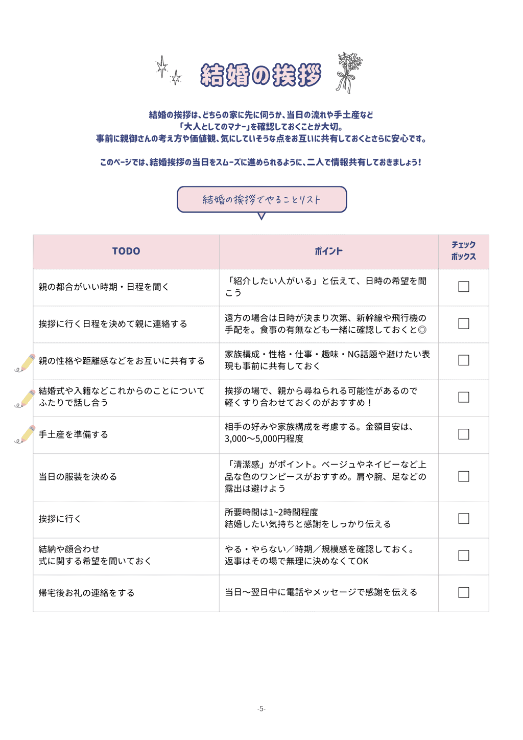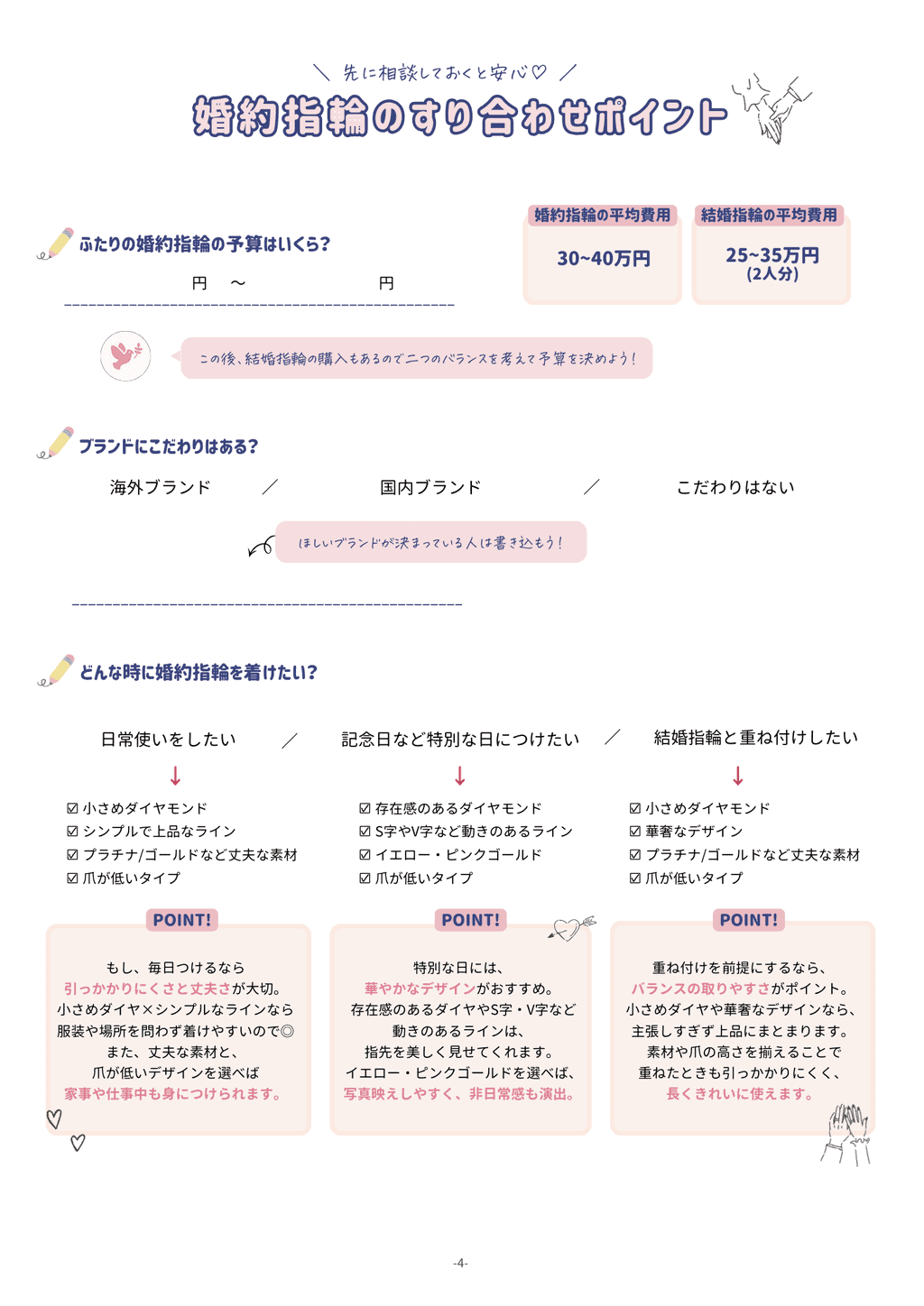また、「すり合わせポイント」のページは、スムーズに準備が進むようにお互いの考え方や、親御さんの希望などをすり合わせて書き込めるようになっています♡