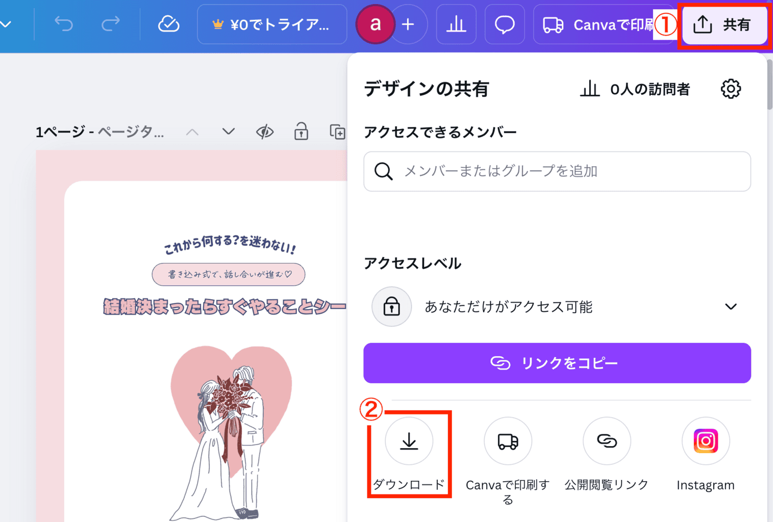 「結婚が決まったらすぐやることシート」は『canva』という無料ツールを使用して配布しています。