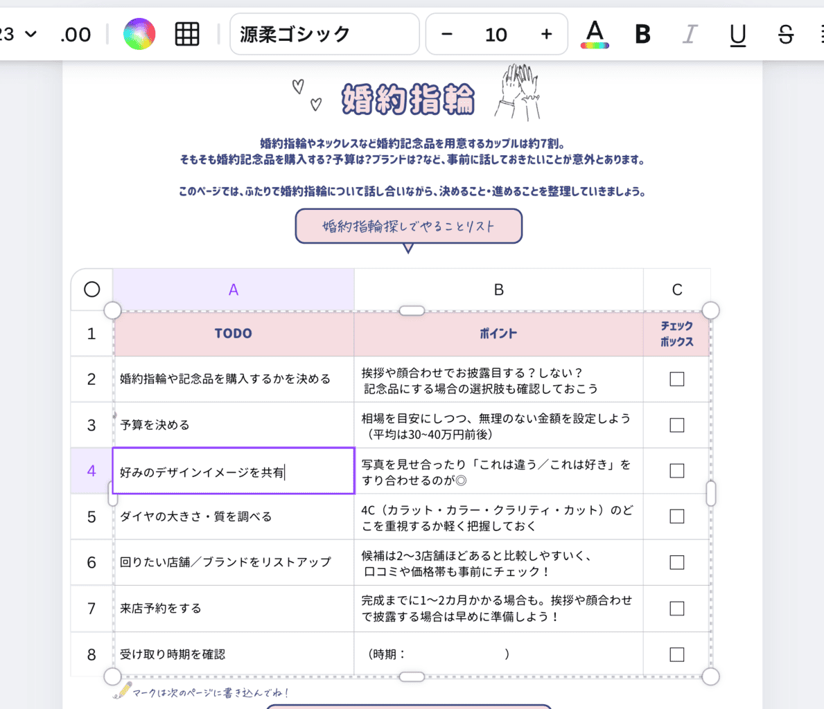 このシートは、TODOをただこなすためのものではなく、「いつまでに?」「どうやって?」「ふたりはどうしたい?」を整理しながら、話し合いを進められるのがポイント♡