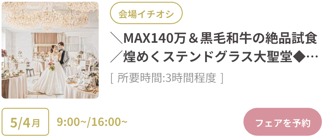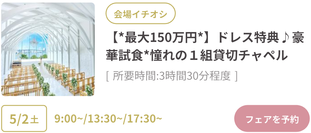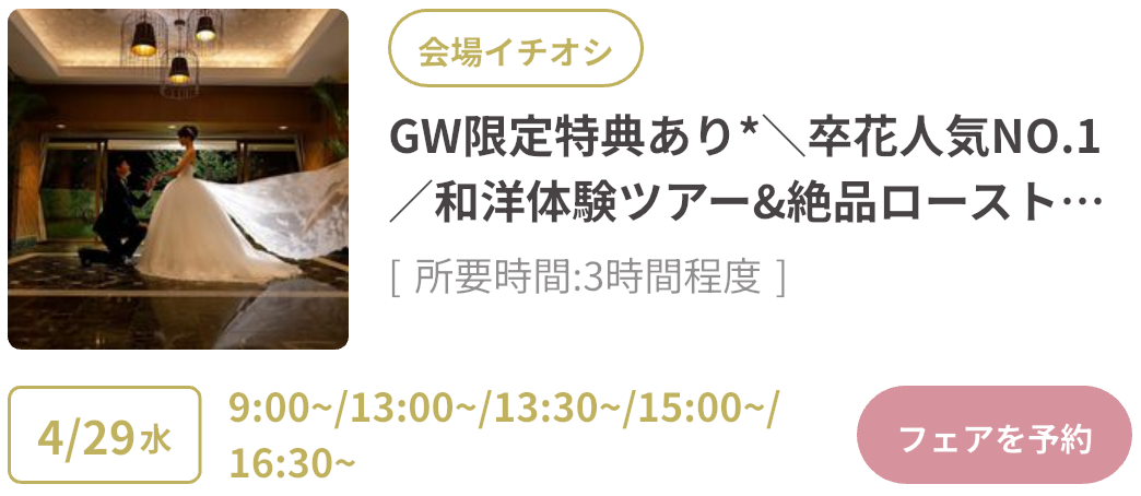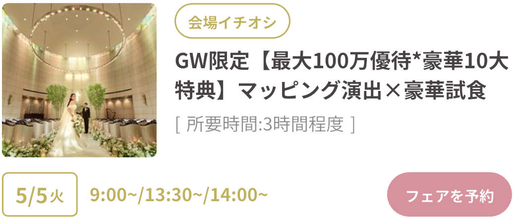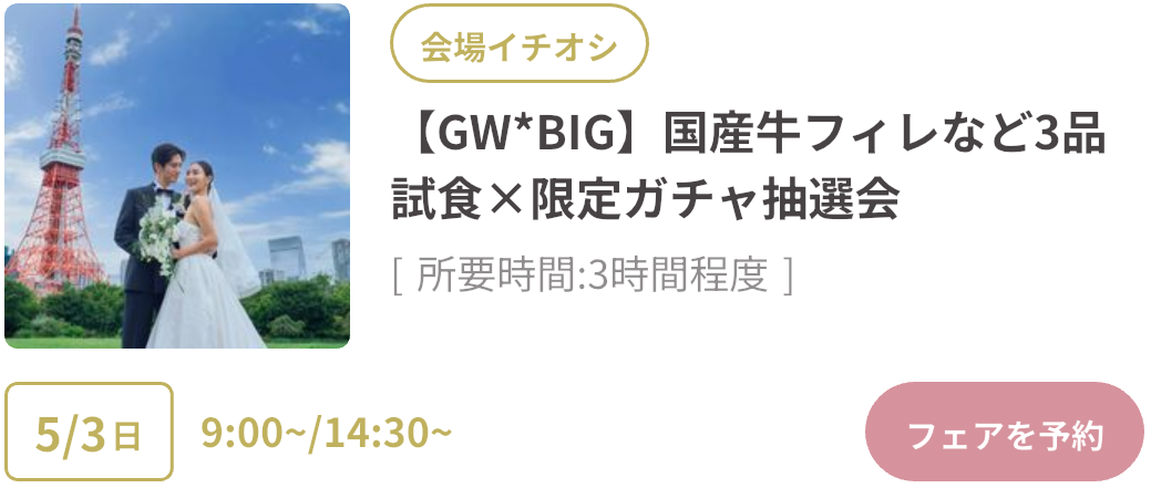 式場探しをはじめるならGWがベストタイミング!GWスペシャルフェアは、豪華試食や来場特典がもらえたり、成約で最大150万円OFFのビッグ特典も。さらにウェディングニュース限定の最大11.4万円もらえるGoToキャンペーンも実施中!「何も決まっていないけど…」そんな方もデートの合間に気軽に式場見学するのがおすすめです♡