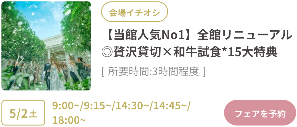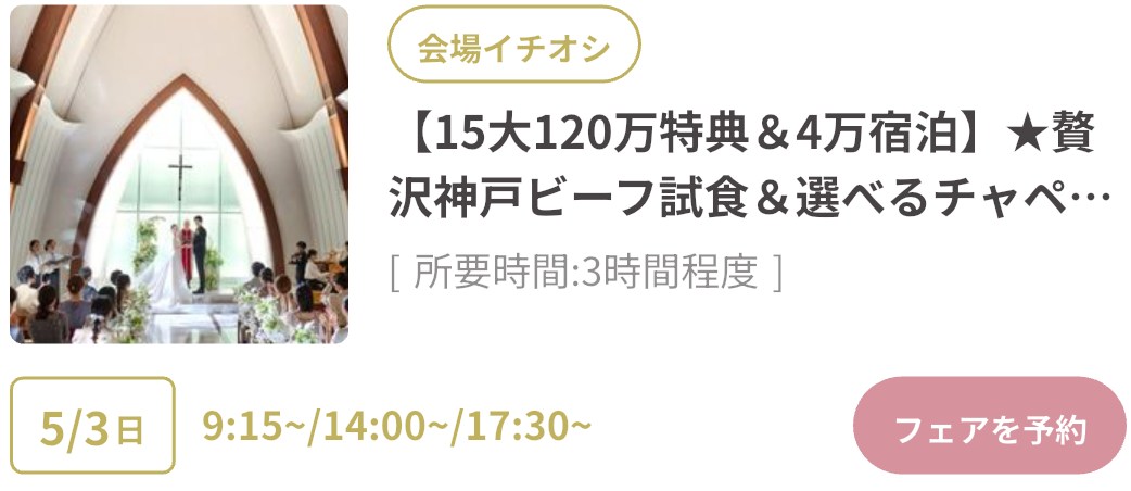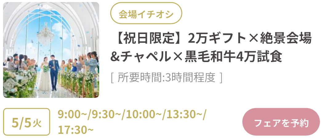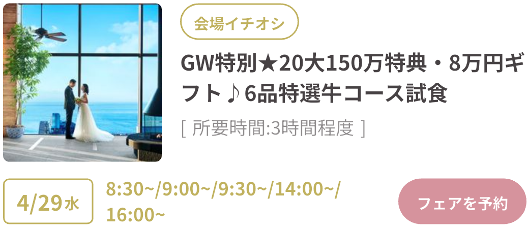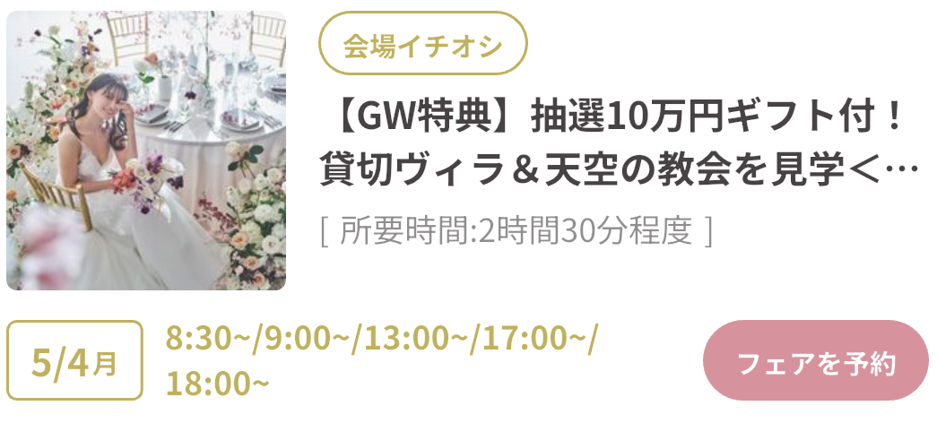式場探しをはじめるならGWがベストタイミング!GWスペシャルフェアは、豪華試食や来場特典がもらえたり、成約で最大150万円OFFのビッグ特典も。さらにウェディングニュース限定の最大11.4万円もらえるGoToキャンペーンも実施中!「何も決まっていないけど…」そんな方もデートの合間に気軽に式場見学するのがおすすめです♡