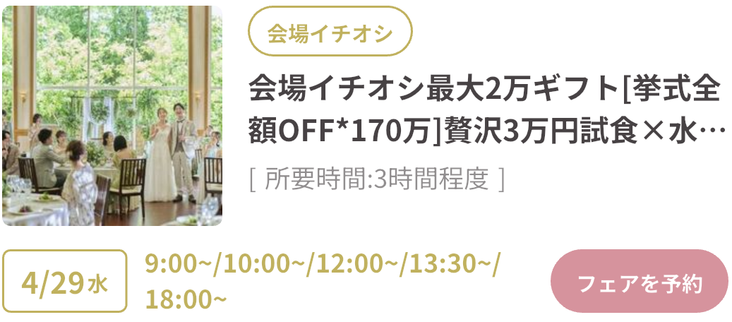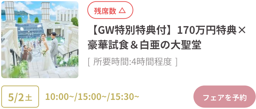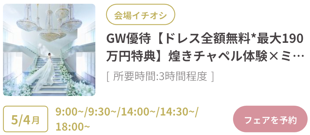 式場探しをはじめるならGWがベストタイミング!GWスペシャルフェアは、豪華試食や来場特典がもらえたり、成約で最大150万円OFFのビッグ特典も。さらにウェディングニュース限定の最大11.4万円もらえるGoToキャンペーンも実施中!「何も決まっていないけど…」そんな方もデートの合間に気軽に式場見学するのがおすすめです♡