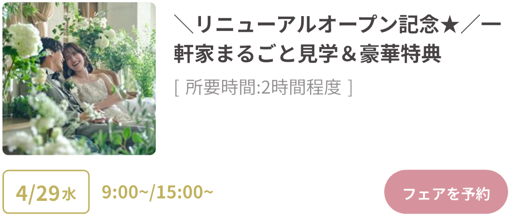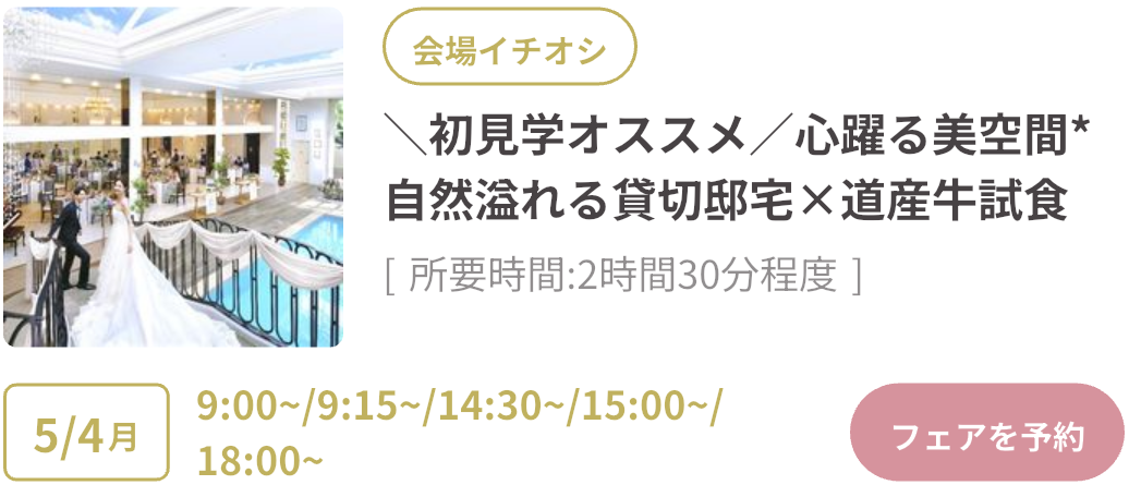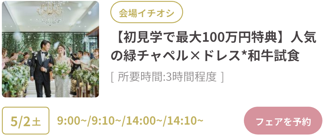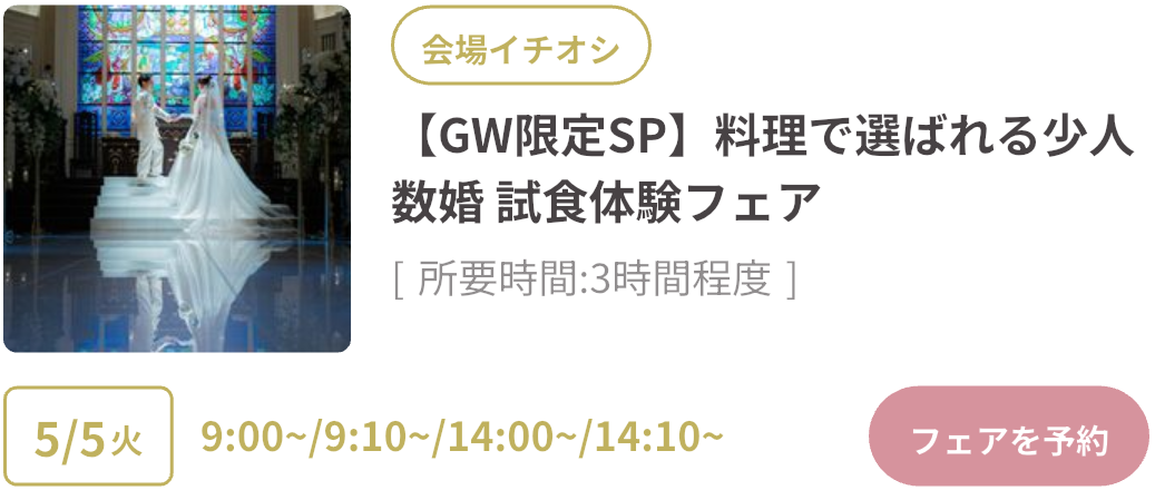 式場探しをはじめるならGWがベストタイミング!GWスペシャルフェアは、豪華試食や来場特典がもらえたり、成約で最大150万円OFFのビッグ特典も。さらにウェディングニュース限定の最大11.4万円もらえるGoToキャンペーンも実施中!「何も決まっていないけど…」そんな方もデートの合間に気軽に式場見学するのがおすすめです♡